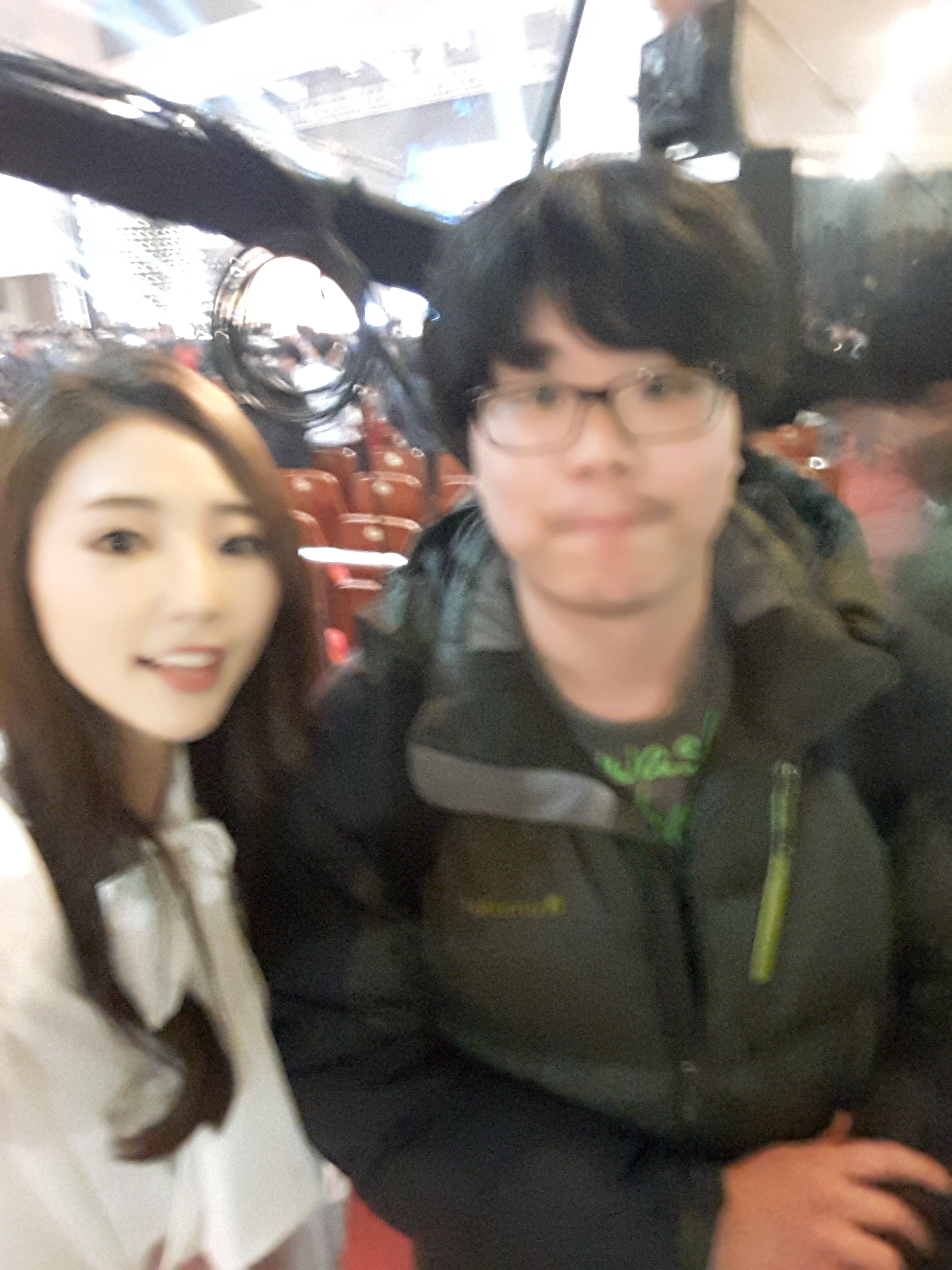 크로우 : 음... 처음에는 다가가기 어려웠습니다. 저 스스로가 색안경을 끼고 여자 아나운서들을 부정적인 시선으로 바라봤었기 때문인데요. 차후에 그것이 크게 잘못된 편견이라는 것을 깨달았습니다. 깨닫기까지는 시간이 좀 걸렸었죠. 트라우마도 있었고... 근데 나중에는 제가 용기를 내서 다가가고 인사드렸더니 친절하게 맞아 주셨습니다. 그러다 보니까 이렇게 사진도 남기게 되었구요.